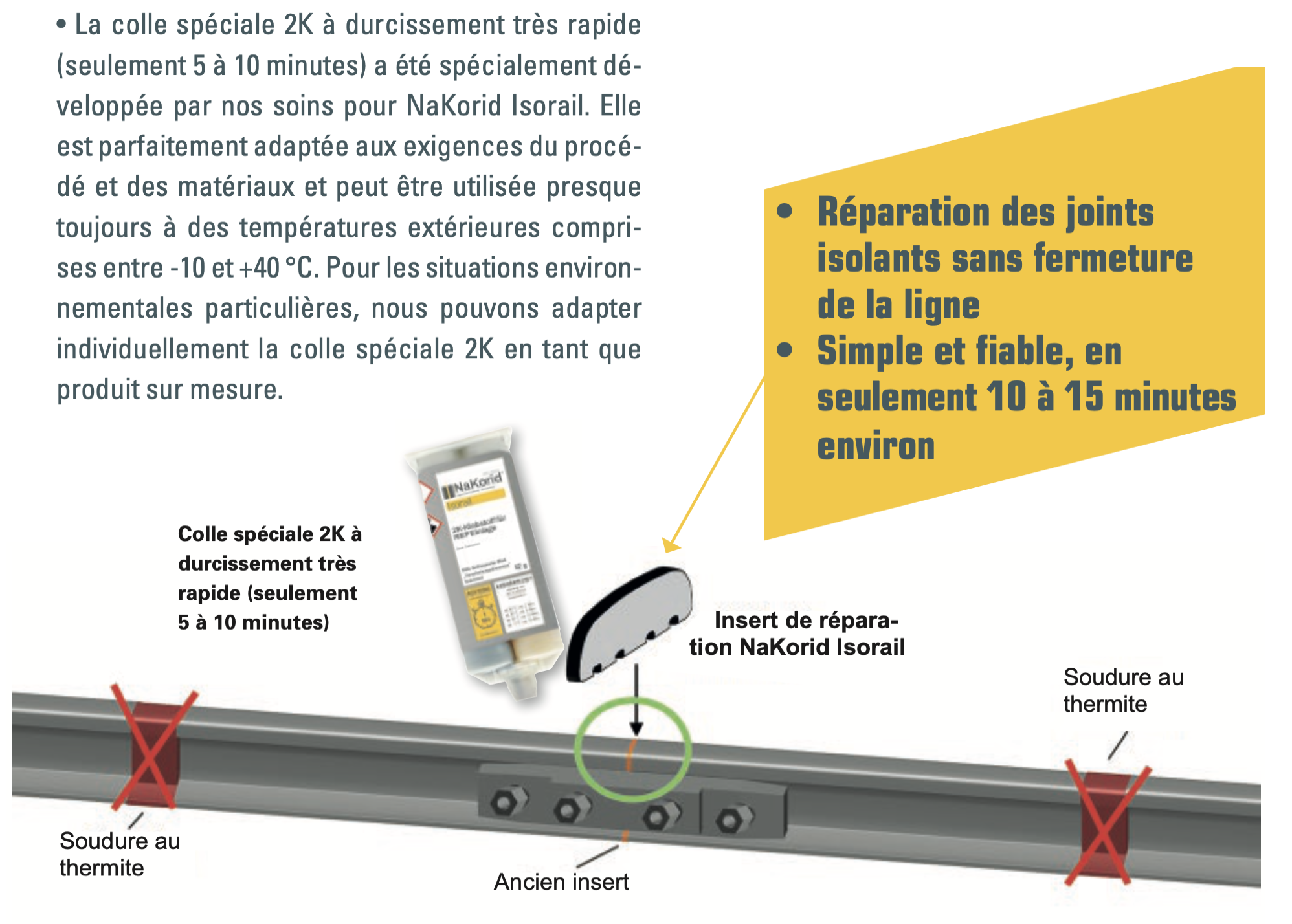 Le nouveau procédé de réparation des joints isolants NaKorid Isorail est rapide et simple et vous évite des travaux fastidieux, tels que le remplacement du joint isolé par soudage thermique dans la voie.